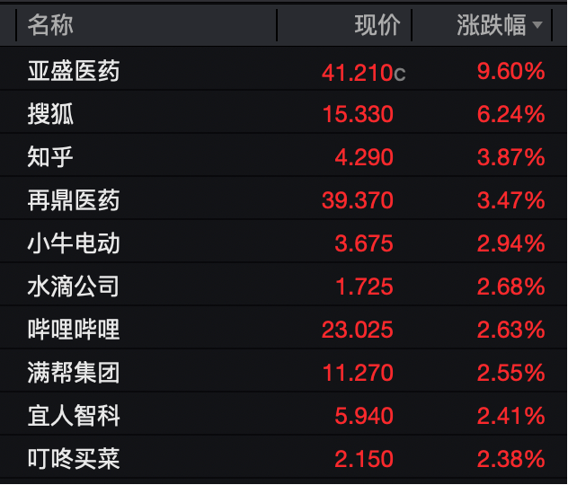 纳斯达克中国金龙指数小幅上涨。亚盛医药涨近10%,搜狐涨超6%,知乎、再鼎医药涨超3%。