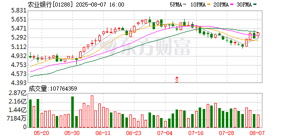 8月7日,农业银行股价再涨1.36%,收于6.71元/股,总市值达2.35万亿元,A股流通市值达到2.14万亿元,继续雄霸A股流通市值榜首。