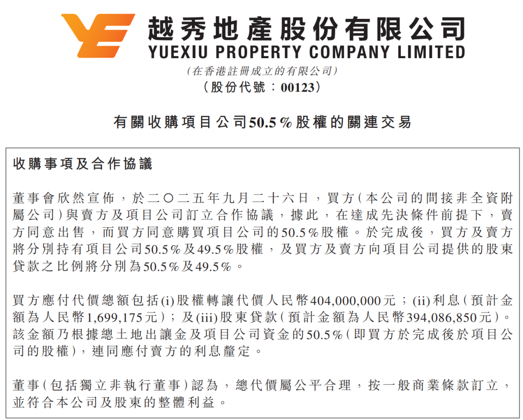 9月26日夜间,越秀地产发布公告。该公告表示于2025年9月26日,买方(该公司的间接非全资附属公司杭州越珑房地产开发有限公司)与卖方杭州滨江房产集团股份有限公司及项目公司杭州滨德房地产开发有限公司订立合作协议,据此,在达成先决条件前提下,卖方同意向买方出售项目公司的50.5%股权。于完成后,买方及卖方将分别持有项目公司50.5%及49.5%股权,及买方及卖方向项目公司提供的股东贷款的比例将分别为50.5%及49.5%。