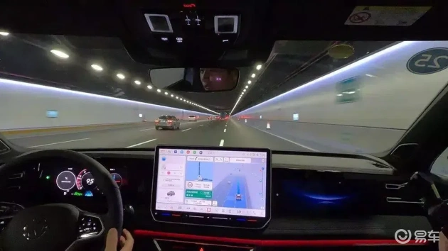 一个有趣的例子是,当车辆进入隧道后,原车道变成了左侧虚线,意味着允许超车,但又因为有桩桶存在,变道无法实现。在这样的“纠结”情况下,车辆的行驶依然非常平稳,没有出现不规则的加减速或忽左忽右的现象,这表明系统的整体逻辑是合理的,优先保障当前的安全行驶。