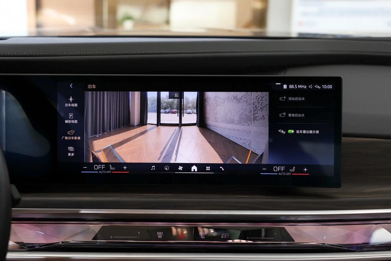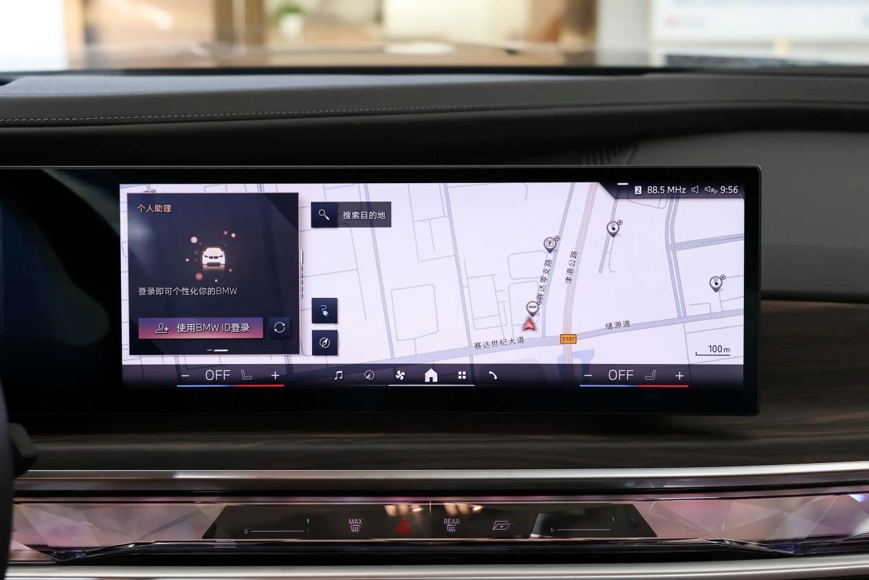 宝马i7的内饰给人一种豪华的氛围感,两辐式方向盘也采用真皮材质,除了支持上下+前后调节,还具备记忆等功能,但换挡方式为传统的电子挡把,稍微有点不符合它新能源车的身份。车内配备了12.3英寸全液晶仪表盘、14.9英寸中控屏,其中中控屏有高通骁龙8155P芯片的加持,配合iDrive操作系统,具备4G网络、手机互联映射、应用下载等功能,语音识别功能可接受来自前两排座椅的语音。其次,宝马i7还配备了自动防眩目内后视镜、多色氛围灯、宝华韦健品牌音响等配置。