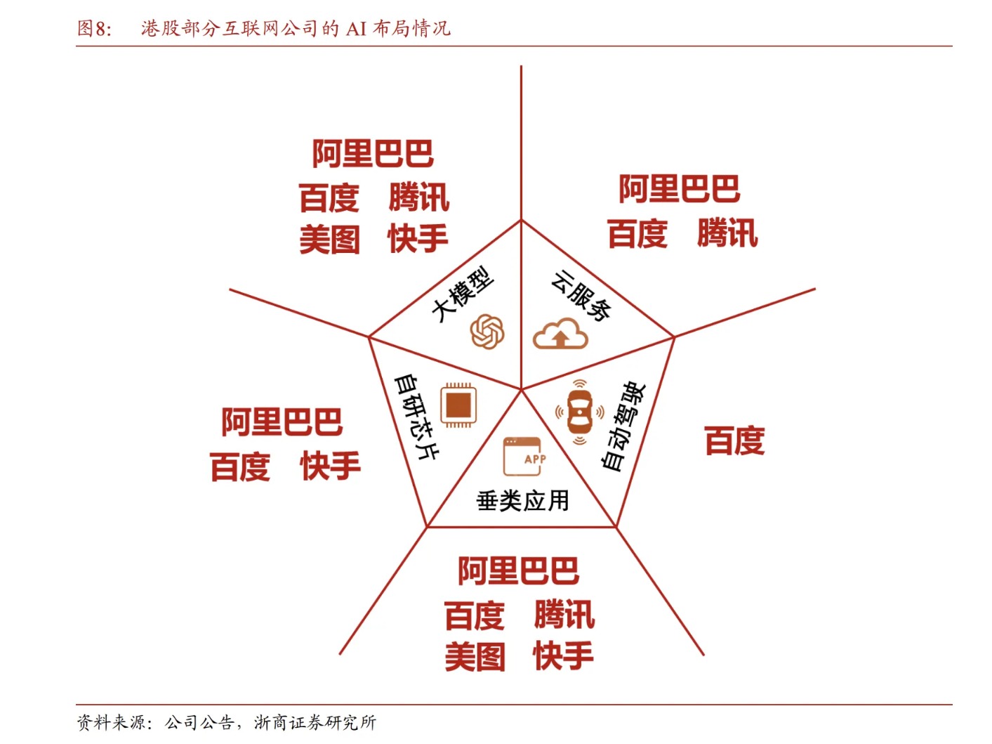 一类以通用大模型和云计算为核心方向,代表性公司有阿里巴巴、百度、腾讯等;另一类以垂类应用为突破口,代表性公司有美图、快手等。当前两类公司的AI业务正迎来快速发展期。
