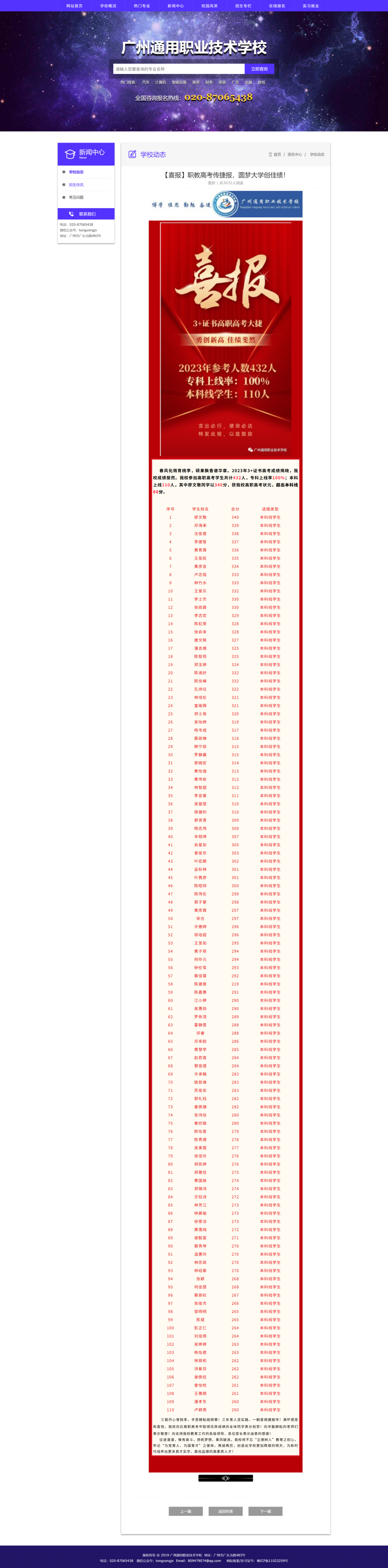 广州通用职业技术学校官网的这则喜报介绍,“春风化雨育桃李,硕果飘香谱华章。2023年3+证书高考成绩揭晓,我校成绩斐然。我校参加高职高考学生共计432人,专科上线率100%;本科上线110人,其中廖某某同学以340分,获我校高职高考状元,超出本科线80分。”