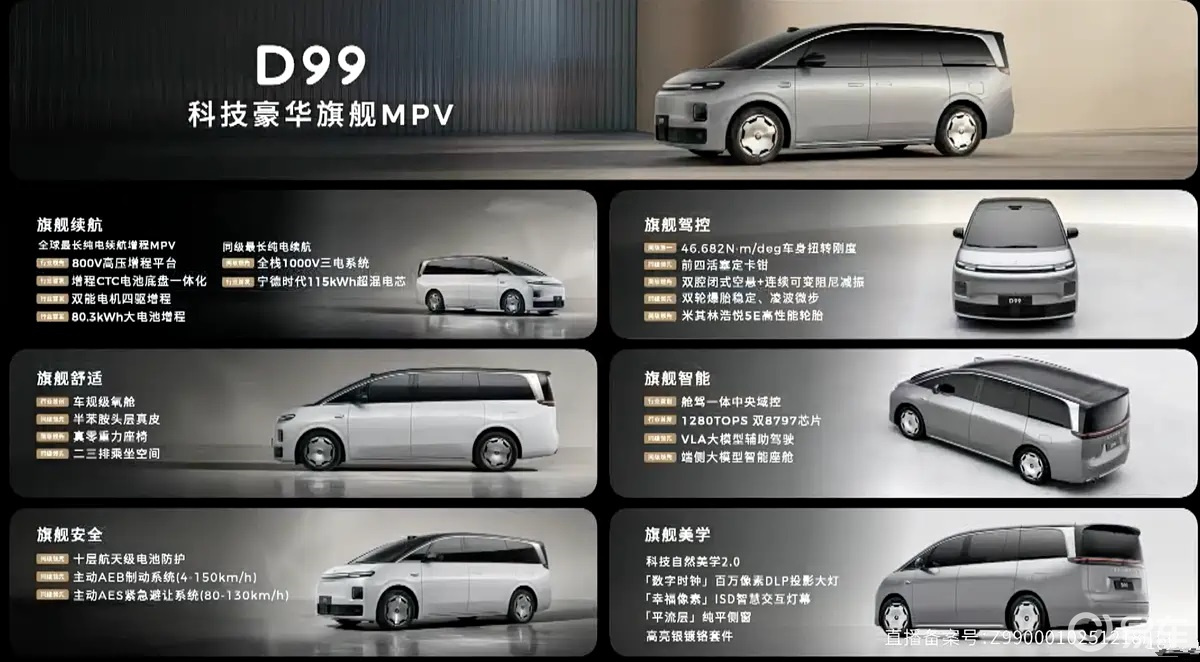 在车身的侧面,零跑D99采用的是很厚重的风格打造,新车采用的是非常方正的轮廓,车顶采用了下沉式的风格,D柱的上方还有镀铬的装饰,看起来很有质感。新车的侧面车窗采用的是纯平设计,前侧还有一个较大的三角窗。新车的侧面中间采用的是极简化的效果,它采用了隐藏式的门把手,这个细节在MPV当中倒是不多见。它的大饼式的轮毂是一大亮点,增加了整车的气场。