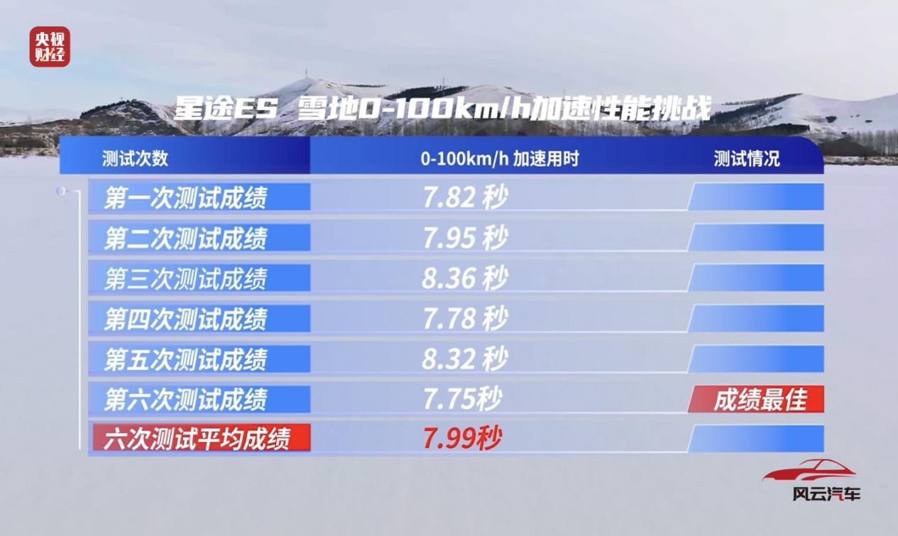 在经过6次反复测试后,星途ES增程交出一份满意答卷。0-100km/h加速平均测试成绩为7.99秒,最佳成绩达到7.75秒。这一表现主要得益于其强大的雪豹四驱动能。其采用前后双永磁同步电机,电机总功率达345kW,电机总扭矩达634N·m,为冬季出行提供坚实的动力支撑。更令人安心的是,车辆在加速至100km/h后,制动响应也十分迅速,车身姿态稳健,有效规避冬季常见的高速制动跑偏与距离过长隐患,为用户带来冰雪驾趣与安全保障的双重体验。